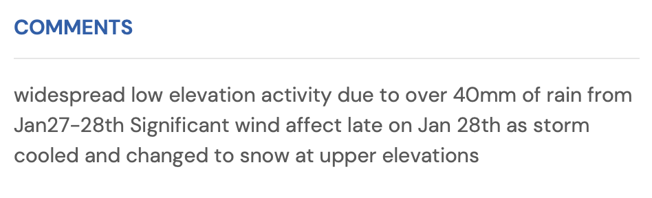 On January 23, user Trapper Gilowski observed over 30cm of fresh snow either by precipitin or wind loading.